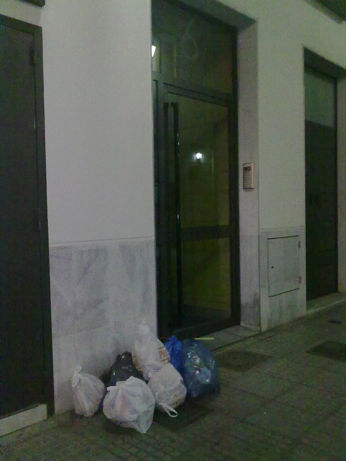 Centro histórico de Cádiz, cualquier noche de esta primera semana de noviembre. Imagen de un portal con bolsas de basuras en el pavimento, y sin su correspondiente bidón. ¿Dónde está el susodicho depósito?No es de recibo que exista una normativa medioambiental y aquí todos se la salten a la torera, unos porque son unos flojos -aquellos vecinos que no sacan el bidón y la bolsa la ponen directamente en la calle- y otros porque descuidan la labor de limpieza -la concesionaria de recogida de basuras y la Delegación de Limpieza Medio Ambiente del Ayuntamiento de Cádiz.